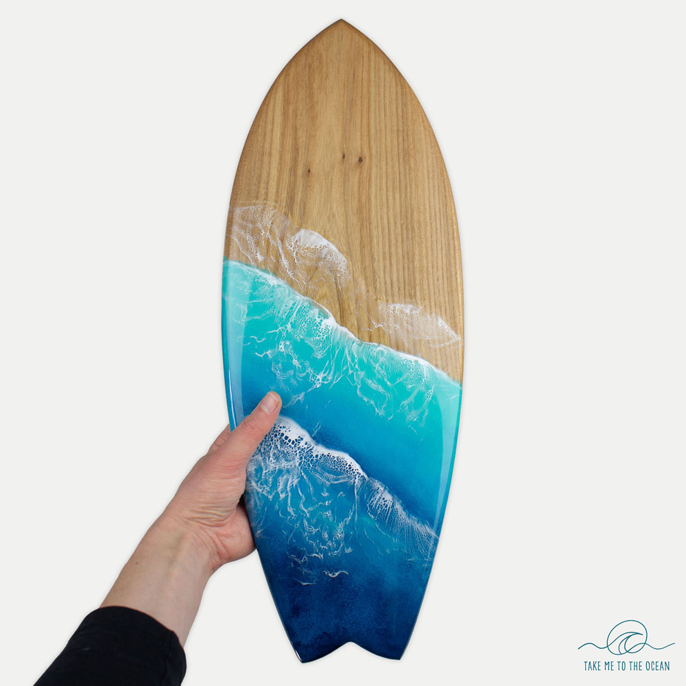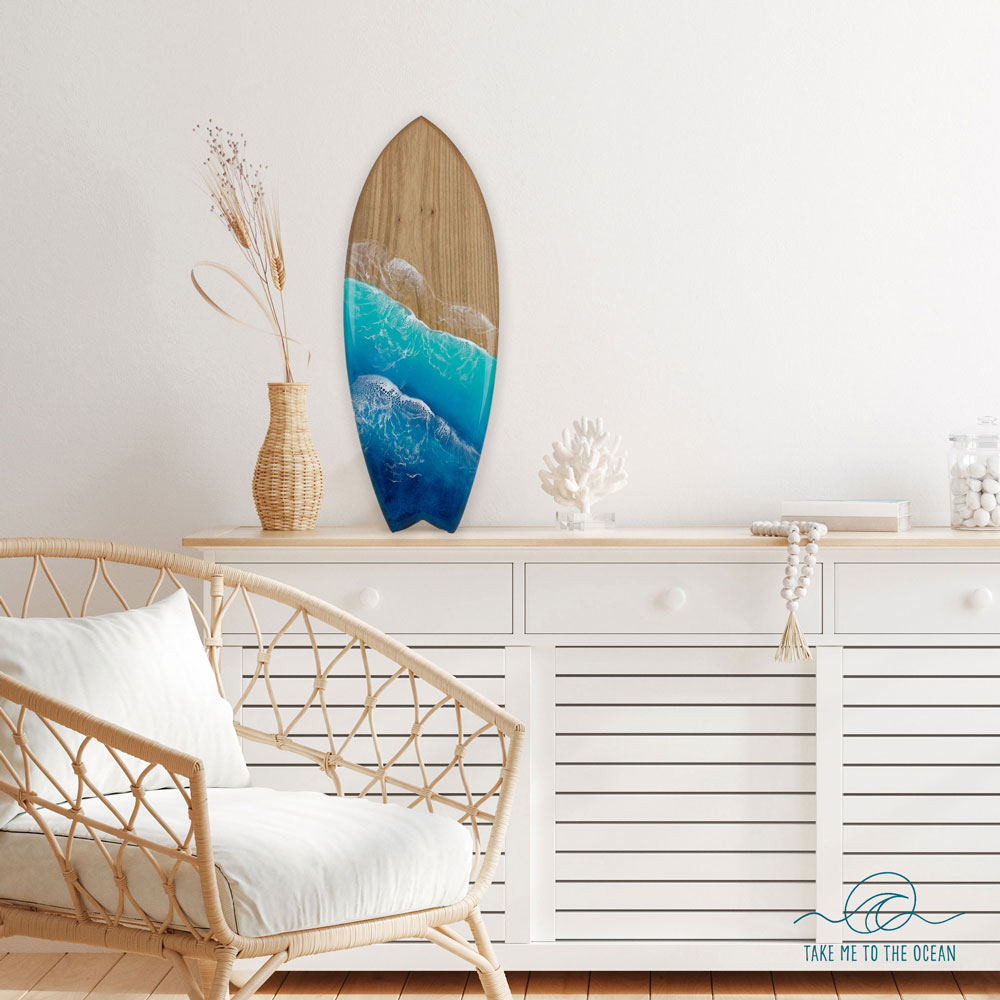 Aloha! This beautiful decorative surfboard is a handmade surfboard made from elm wood and resin to create the ocean art. It is the perfect art on the wall gift for you or your beach loving friend, to get those beach vibes in your home or home office.